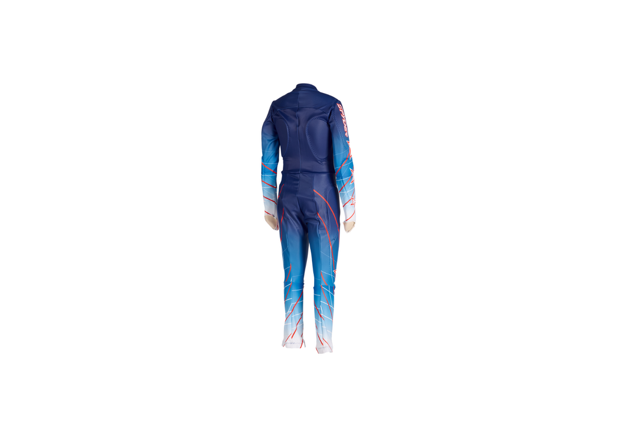 The Spyder Performance GS Race Suit for girls is designed with an anatomically contoured fit and pad placement for ultimate protection. It has forearm, elbow, upper arm, thigh and knee pad protection with a front stretch zipper. The thumb anchors and gripper elastic at the hem, make for a secure fit. It is made with a micro polyester knit bonded to a breathable laminate.