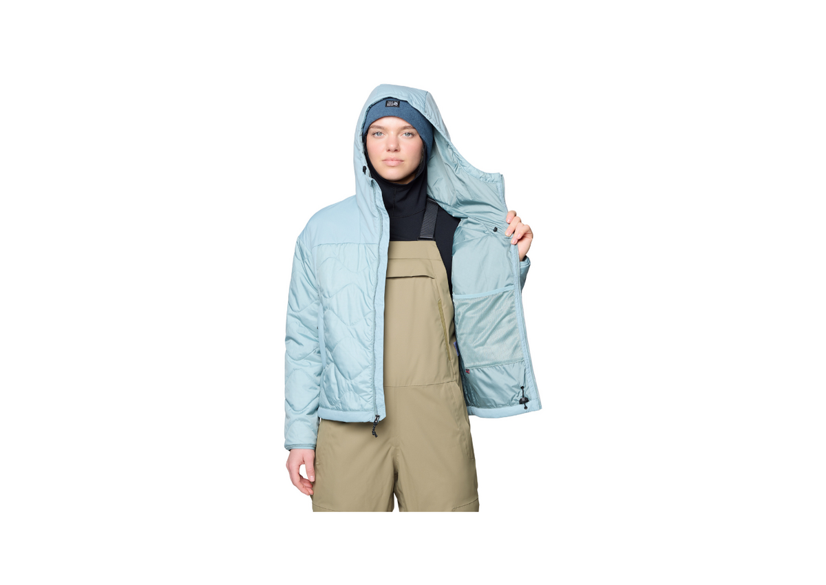 Mountain Hardwear's Women's Après Pro™ Insulated Hooded Jacket is an insulated jacket that can serve as a lightweight outer layer or a waterproof under layer.